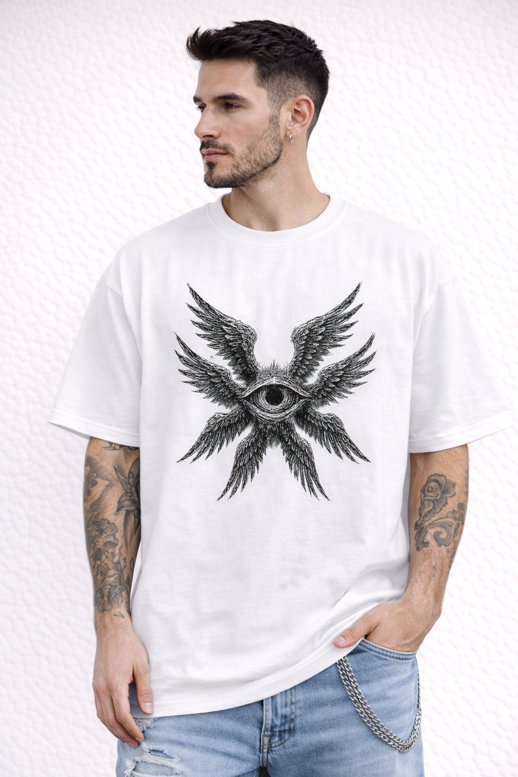 This striking angel wing eye design represents mystery and higher consciousness. Printed on a clean white t-shirt with high-quality ink, it’s ideal for gothic, spiritual, and aesthetic fashion enthusiasts.