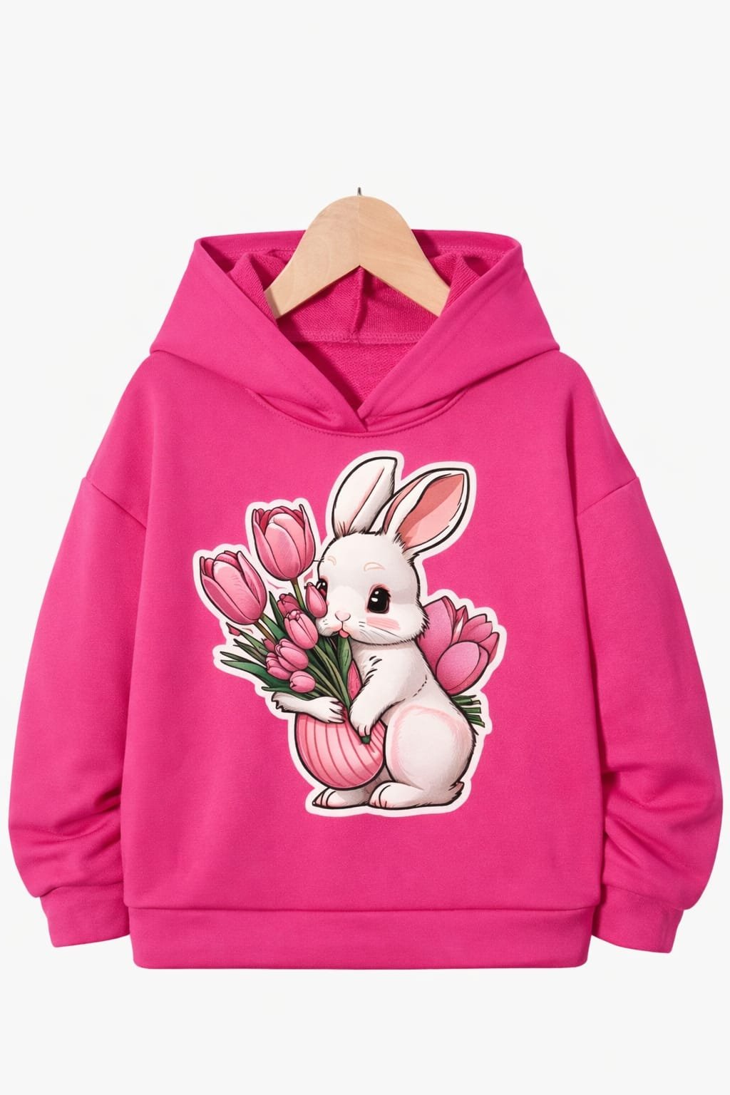 Add a touch of cuteness to your winter wardrobe with our Cute Bunny Blossom Hoodie – Pink Oversized Edition. Featuring an adorable bunny illustration holding fresh tulip flowers, this hoodie blends soft aesthetics with cozy comfort.