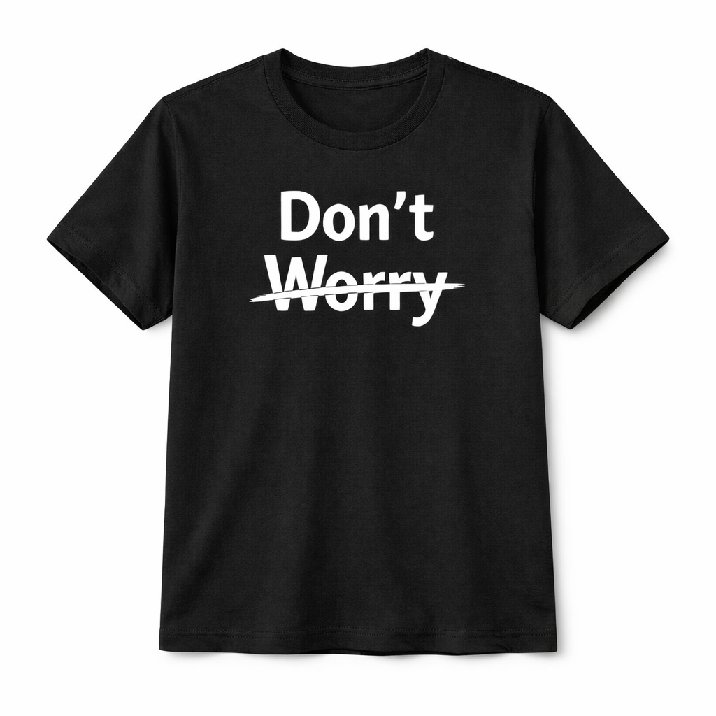 The Don’t Worry T-Shirt features a clean, minimalist typography design with a crossed-out effect, delivering a subtle yet powerful message of calm and confidence.